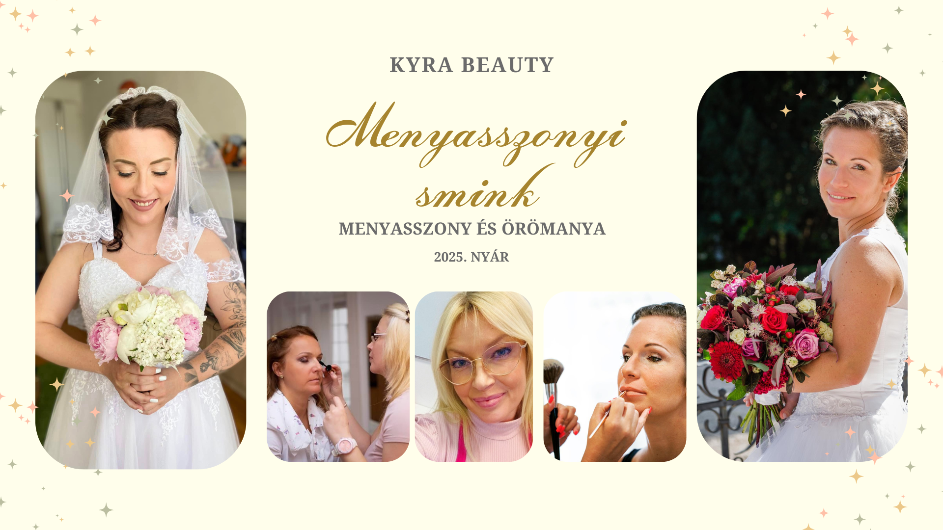 Örömanyáknak és a koszorúslányok sminkjét is elkészítem. Ha fontos számodra az esküvő színkombinációja és az összhang, akkor színben és stílusban ehhez igazítjuk a sminkeket is. Így mint egy virágköltemény, vagy egy csodás festmény kompozícióban tündökölhettek.